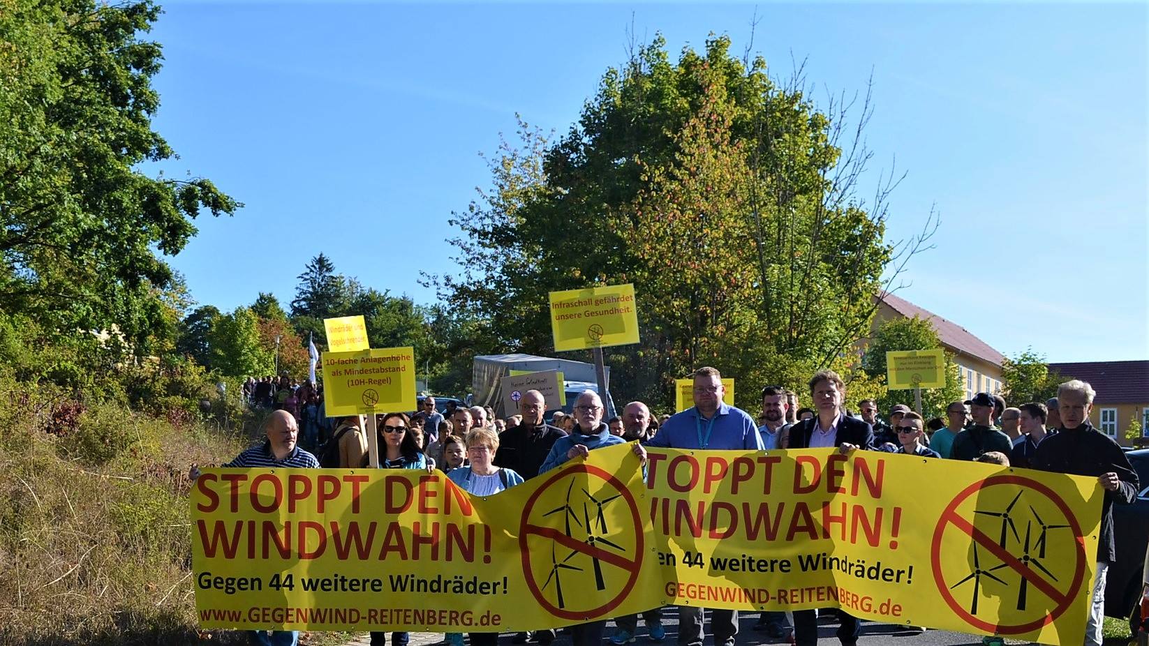 Für den Vorstand unseres Vereins „Gegenwind Reitenberg e.V.“ haben Matthias Diskau, Kathy Wiegand und Sebastian Bethge zu den Teilnehmern der Demo gesprochen. Matthias Diskau forderte in seiner Rede u.a. eine 10H-Regelung. Kathy Wiegand erläuterte die Belastung durch eine Erweiterung der Deponie in Mihla. Sebastian Bethge sprach zum Windenergieerlass der Thüringer Landesregierung, der nur Abstände nur als unverbindliche Empfehlungen enthält und damit weder Mensch noch Natur schützt.